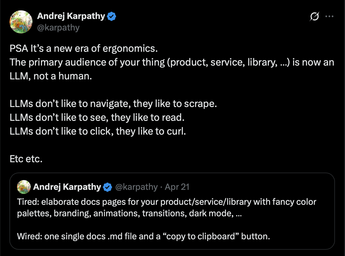 Interesting insight from @karpathy on X that sees the llm as your customer